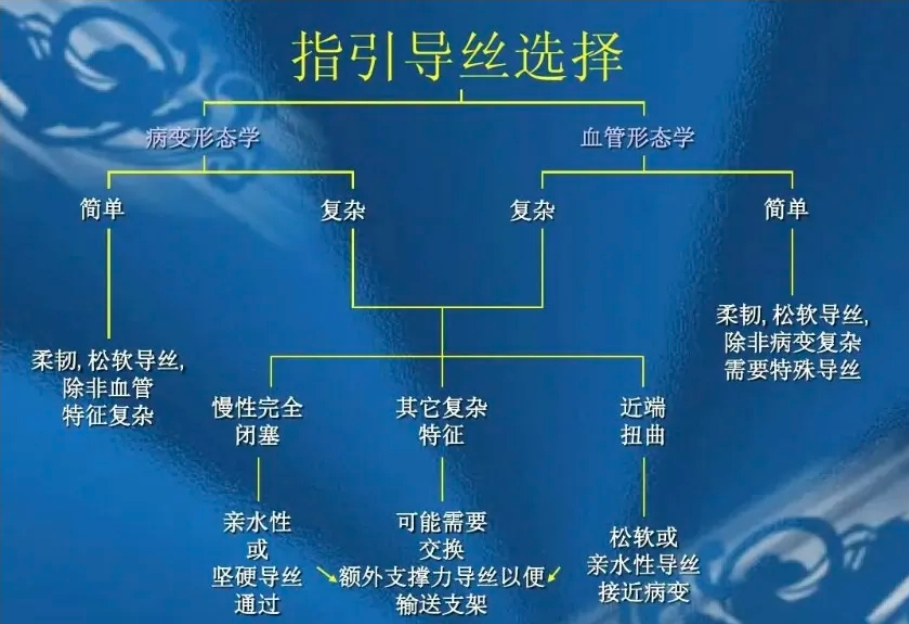 导丝是冠状动脉介入的基本器械之一,用于进入冠状动脉或跨过迂曲、钙化、狭窄、侧枝循环到达目标,建立轨道输送球囊、支架和微导管;对于导丝升级或者降级的技术打开冠状动脉闭塞病变;预入冠状动脉分支作防护及路标功能等等。