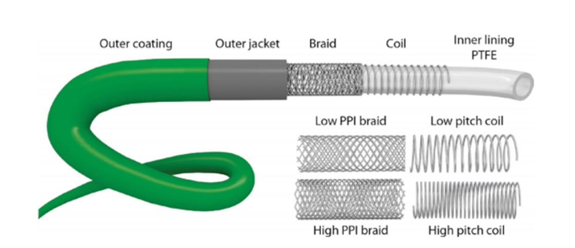 沿着导管的长轴可以使用多种不同的线圈,因为不同线圈之间的连接非常简单。螺距(或称为线圈缠绕之间的距离),可以显著影响硬度、抗扭结性和可推送性,较宽的螺距可提供更好的柔软度,但会增加扭结风险并降低可推送性。