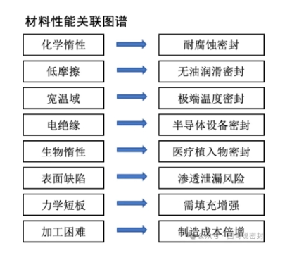 全生命周期评估:PTFE生产过程涉及氟化工,碳足迹达12kg CO₂/kg材料,远超橡胶的2-3kg CO₂/kg。尽管长寿命特性可部分抵消环境影响,但亟需清洁生产技术突破。