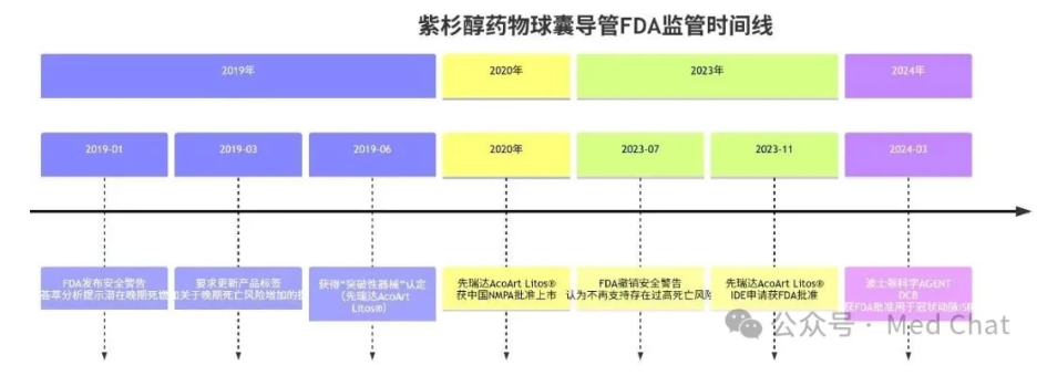 但在2019年1月,美国食品药品监督管理局(FDA)发布了紫杉醇药物球囊扩张导管的安全警示,即提示使用紫杉醇涂层球囊和支架治疗下肢外周动脉疾病(PAD)时,与未涂层器械相比,可能伴随术后约2-5年全因死亡风险的增加。可在2023年7月,FDA又更新了立场,宣布不再支持紫杉醇涂层器械用于外周动脉疾病(PAD)治疗会带来过高死亡风险的结论。FDA认为,经过更全面的数据分析和研究表明,紫杉醇药物球囊扩张导管的获益风险比转为积极,并撤销了先前的安全警告,并不再强制要求其产品标签中包含特定死亡的风险警告。在FDA刚发布紫杉醇药物球囊的安全警示时,国内药物球囊厂家一片哀声,颇有当年雅培撤销可降解支架(Absorb BVS)时国内厂家的反应。此外,当时的紫杉醇球囊的安全警示,也滋生了雷帕霉素涂层球囊扩张导管的研发和注册。