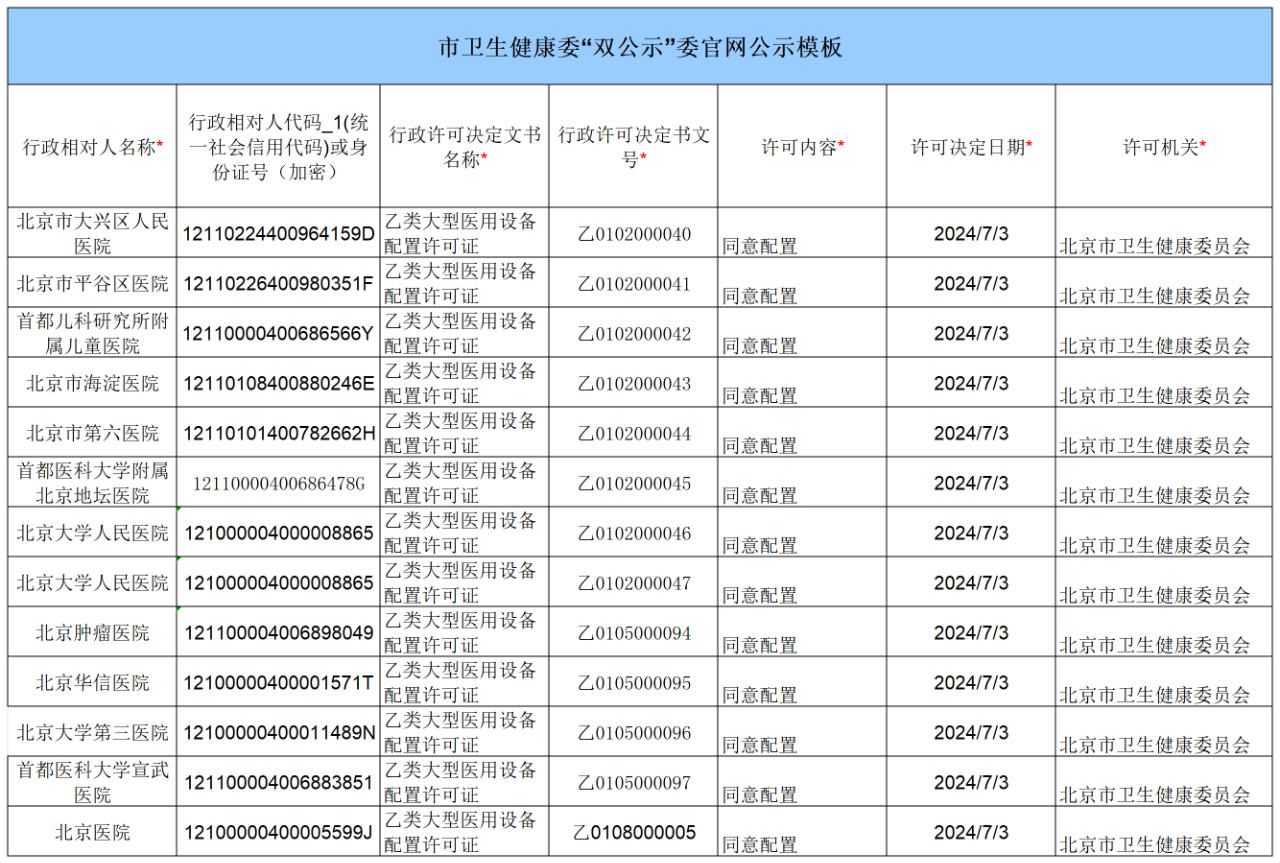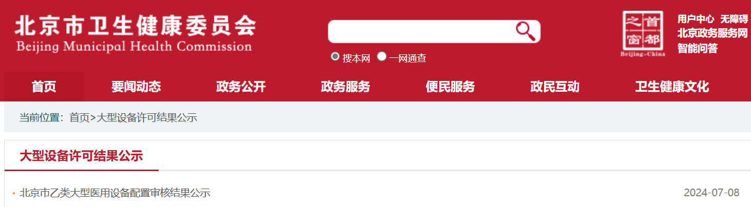 2024年7月8日,北京卫健委又公布一批乙类大型医用设备配置审核结果,发放了4张直线加速器配置证、8张手术机器人配置证以及1张其他类乙类大型医用设备配置证。