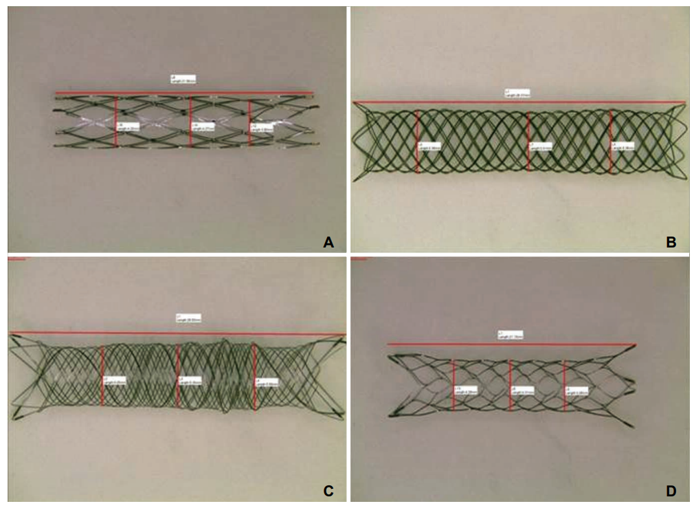 (A)Neuroform 4.0*20.0mm;(B)Leo 4.5*40.0mm;(C)LVIS 4.0*35.0mm;(D)Enterprise 4.5*22.0mm