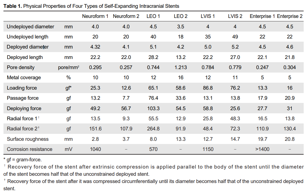 LVIS和LEO支架分别具有最高的垂直力(37.1 gf)和周向力(178.4 gf)。Enterprise支架的支架丝最粗,其次是LVIS、LEO和Neuroform支架