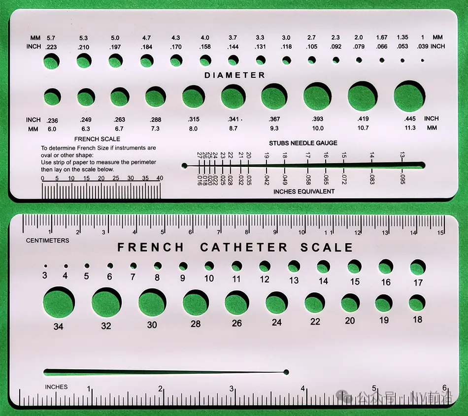 ●French 规格(French Gauge,Fr,或简称 French):一般用于表示导管的外径以及鞘管的内径;1 French = 1/3 毫米。