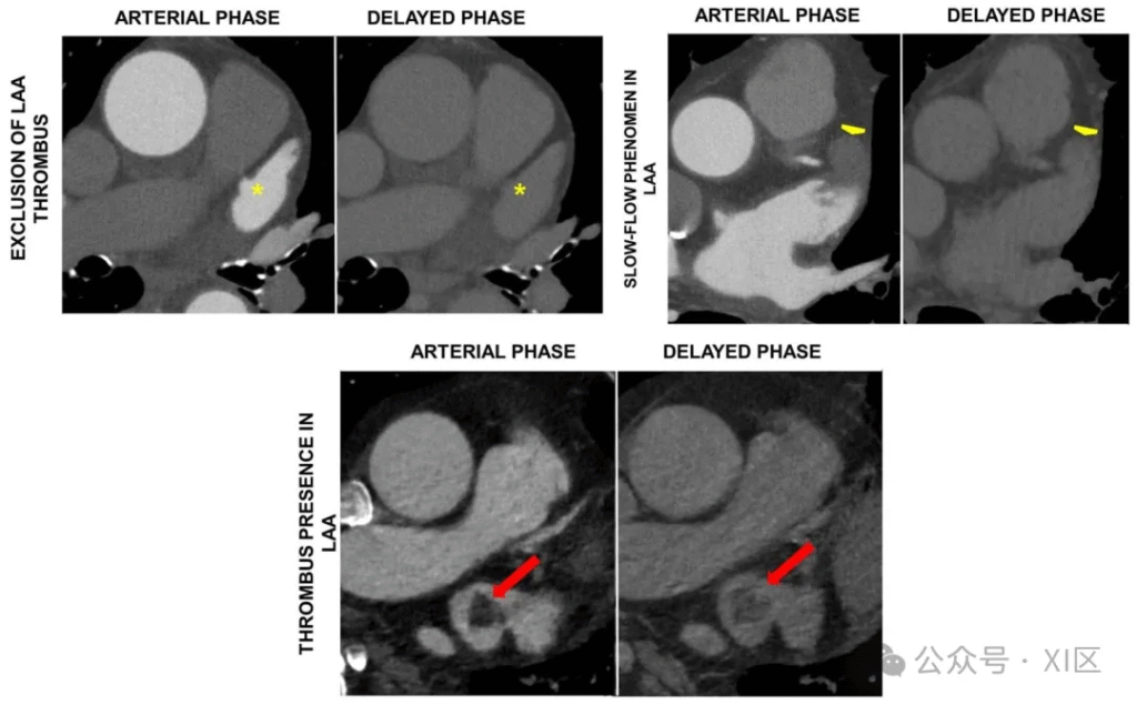 采用心脏计算机断层扫描(CCT)对拟行肺静脉隔离术的房颤患者进行左心耳(LAA)评估,分别展示动脉期(左图)与延迟期(右图)成像结果。左上图为左心耳无血栓的典型案例,两期成像均显示正常造影剂强化;右上图为左心房严重扩大患者的慢血流现象案例,动脉期左心耳远端部分造影剂分布不均且强化缺失,而延迟期左心耳则呈均匀造影剂充盈。下图为左心耳迁移性血栓案例,动脉期左心耳近端出现充盈缺损,且该缺损在延迟期成像中持续存在 。