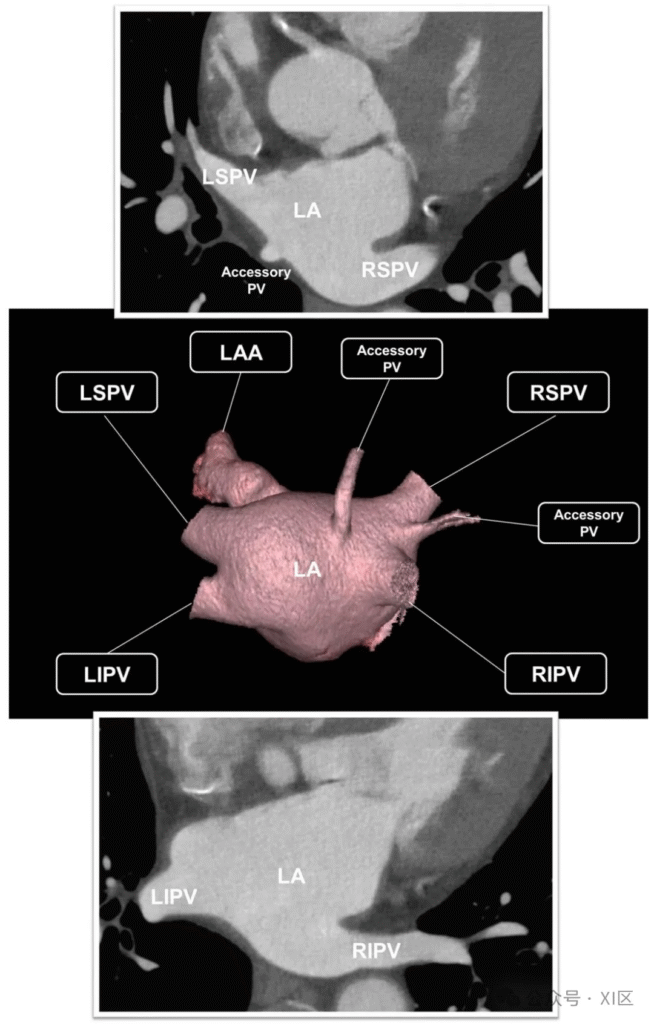 通过心脏计算机断层扫描(CCT)的轴位图像与三维重建技术显示左心房(LA)和肺静脉(PV)的解剖结构。最常见的解剖结构为左心房后部存在四个独立的肺静脉开口:右侧肺静脉中,右上肺静脉(RSPV)与右下肺静脉(RIPV)分别开口,且常被左心房壁分隔;左侧肺静脉中,左上肺静脉(LSPV)与左下肺静脉(LIPV)开口位置通常较为接近,无明显分隔结构。副肺静脉指与同侧上、下肺静脉分开并单独汇入左心房的肺静脉,其命名通常依据所引流的肺段,在人群中的发生率高达 25%,且右侧发生率高于左侧。若存在副肺静脉,其主干通常比主肺静脉更短、管腔更窄,有时可能跨越肺裂 。