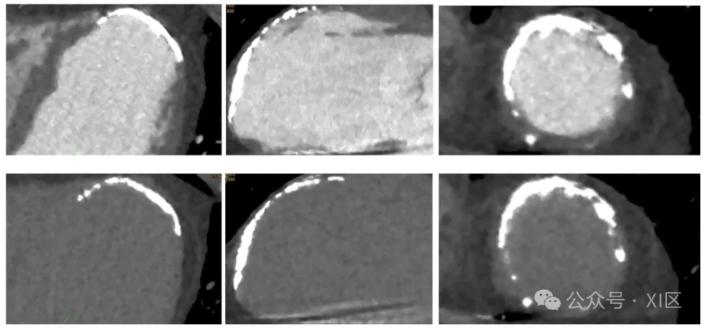 心脏计算机断层扫描(CCT)在室性心动过速(VT)消融中的应用。一名 55 岁缺血性心肌病患者,有广泛心肌梗死病史,为排除左心室(LV)血栓接受 CCT 检查。上图展示左心室的三腔心、两腔心及短轴位增强 CCT 图像;下图为延迟期成像,左心室心尖部、前壁及前间隔部心肌存在严重钙化且运动消失,但造影剂呈均匀强化,可安全排除血栓。该增强 CCT 图像在围手术期用于指导消融操作 。