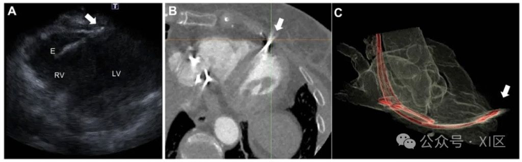心脏计算机断层扫描(CCT)在心脏植入式电子器械(CIED)评估中的应用。一名 63 岁女性患者,10 年前因病态窦房结综合征植入双腔起搏器,1 年前因气胸接受起搏器翻修术,此次因膈肌及胸壁肌肉刺激症状就诊。临床检查与心电图未见明显异常;经胸超声心动图显示左右心室收缩功能正常,但提示右心室心肌可能存在穿孔(A 图)。CCT 进一步证实右心室起搏器电极位于心肌外(B 图、C 图),同时显示起搏器导线及胸壁骨骼结构,并发现心包存在少量积液。最终患者接受右心室电极拔除术并植入新起搏器 。
