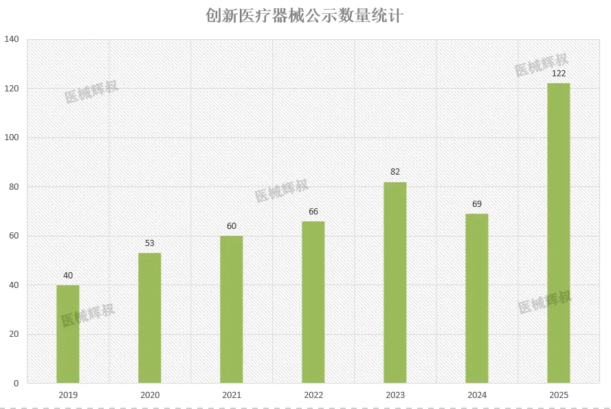 2025年12月24日,CMDE公示了该年最后一批创新医疗器械,其数量创下单月公示新高的18项,而2025年年度总数也达到了122件,较上年的69件,接近两倍的增量。