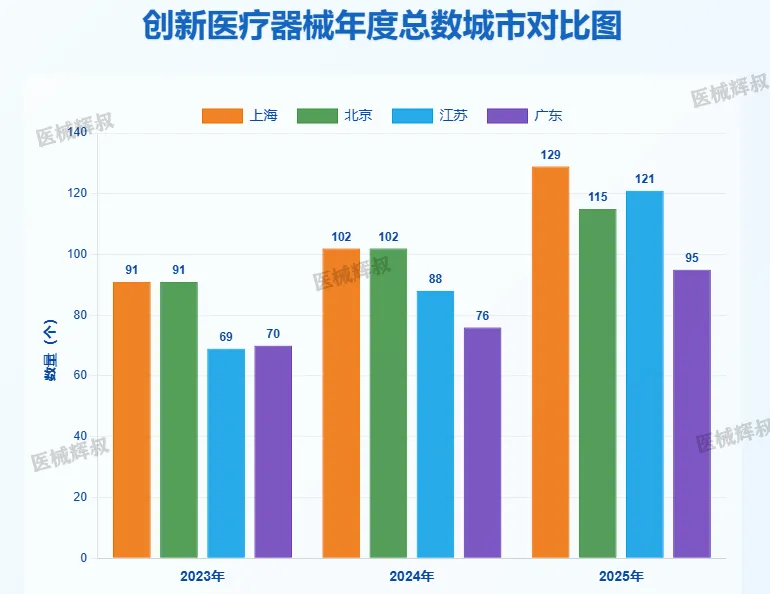 笔者汇总了CMDE公布的近三年各主要省份创新医疗器械年度数据,可见:【2023年度】北京上海双雄制霸形成第一梯队,江苏广东相差无几形成第二梯队;【2024年度】北京上海继续难分伯仲,双城制霸维持第一梯队,而江苏开始小幅领先广东,但与第一梯队还是有较大差距;【2025年度】上海继续蝉联创新龙头,但江苏猛然发力,单年度拿下33件创新,首次反超北京跃居第二,且与第一仅有个位数差距。