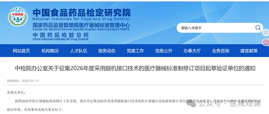 中国食品药品检定研究院(中检院)办公室发布通知,公开征集2026年度采用脑机接口技术的医疗器械行业标准制修订项目的起草验证单位。两项标准分别为: