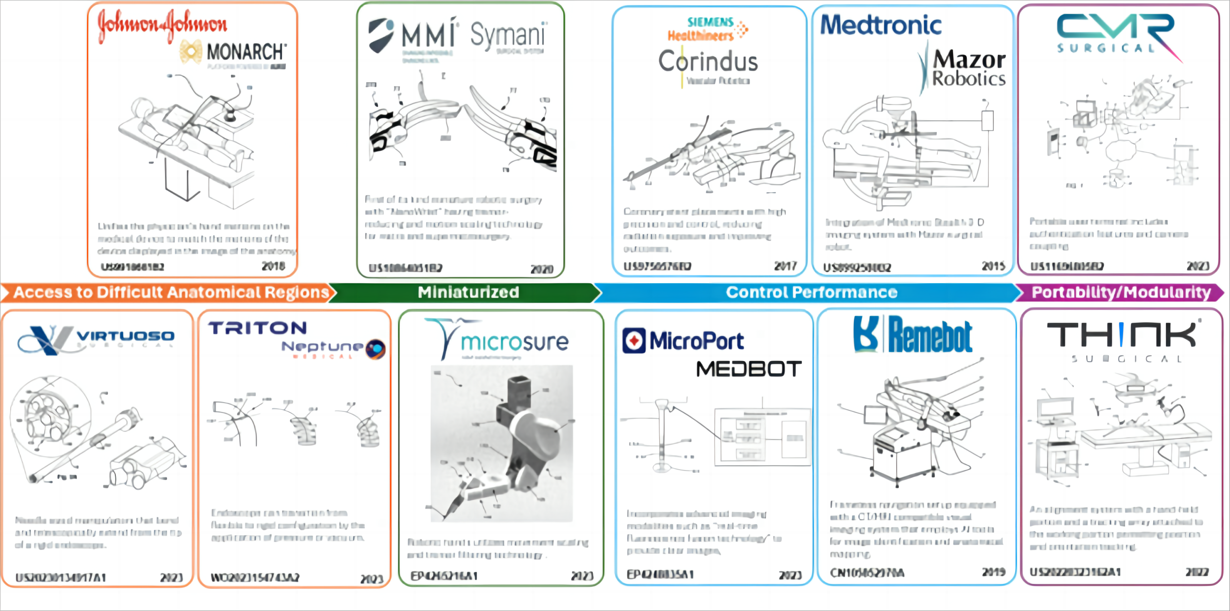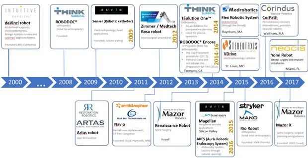 直觉外科手术公司的达芬奇系统的成功,最初专注于腹腔镜手术(妇科和前列腺手术)的腔镜手术机器人刺激了其他外科手术机器人的创新,也正在效仿直觉外科手术公司那样成为细分领域的专利和技术主导地位者。这已成为几个最近获得FDA批准的系统(见下图),以及在欧洲和亚太地区获得批准的系统所采用的成功策略。如: