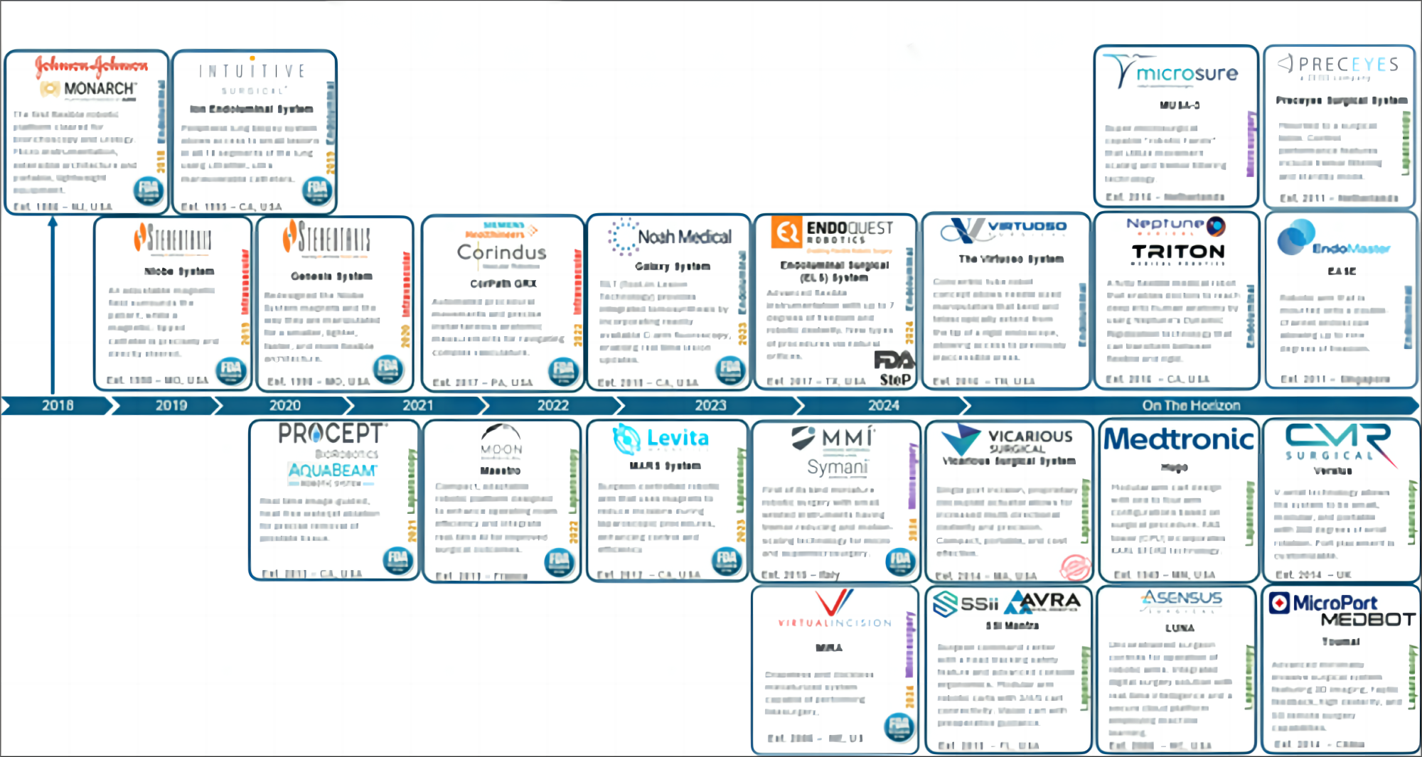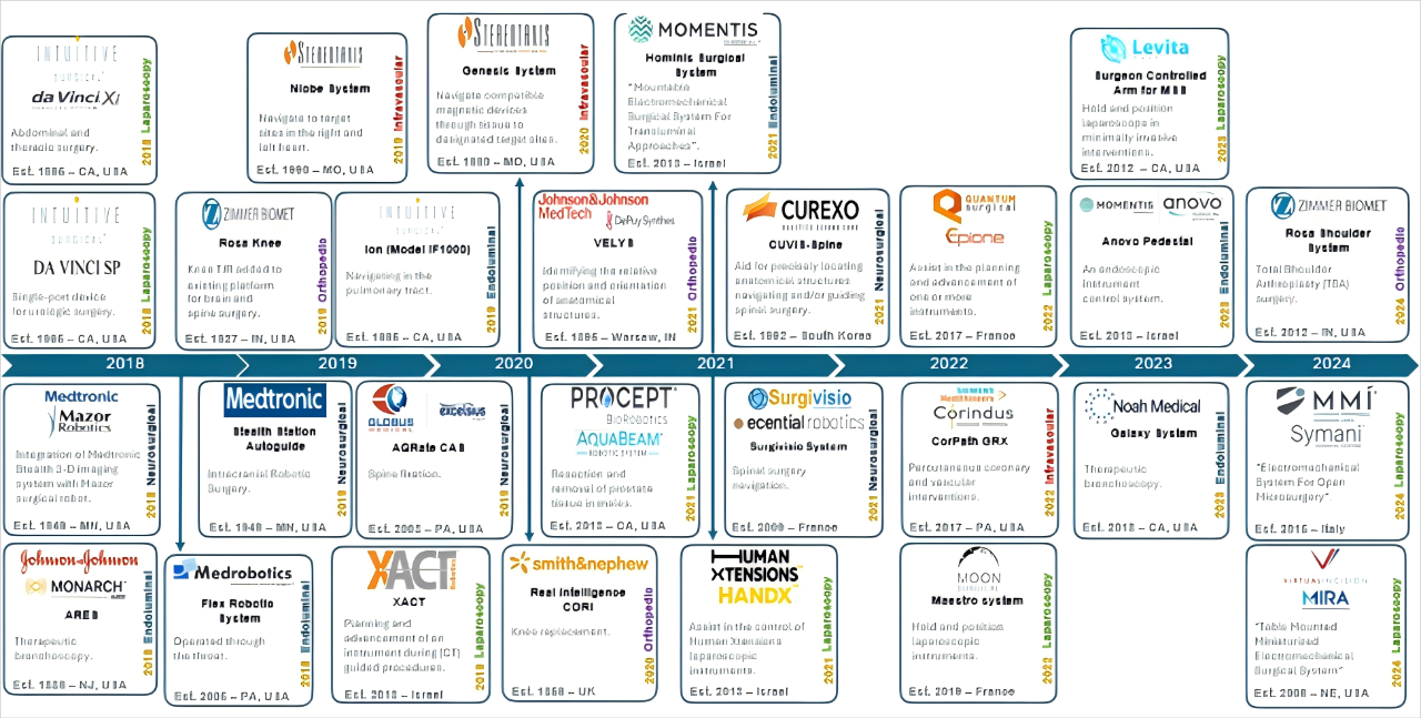 从2018年至2024年间FDA批准的手术机器人的密集时间线上,可以看出手术机器人技术的快速发展和前景(参见下图)。