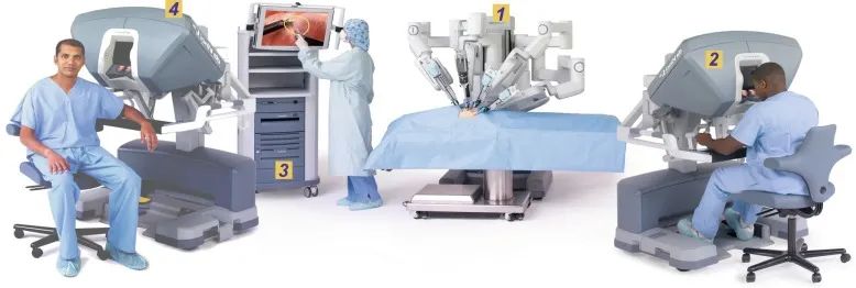 下图 达芬奇系统总体结构。从动操作器(1)、主控控制台(2)、控制单元(3)。可选地,第二个主控台(4)允许双外科医生四手操作。