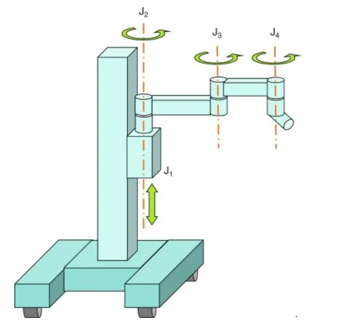 下图展示了达芬奇系统的最初4个自由度(DoF)。电动驱动的棱柱关节J1允许根据患者身高调整臂的高度。关节J2、J3、J4形成一个SCARA被动臂,并配有强力刹车,一旦臂正确就位即可锁定它们。