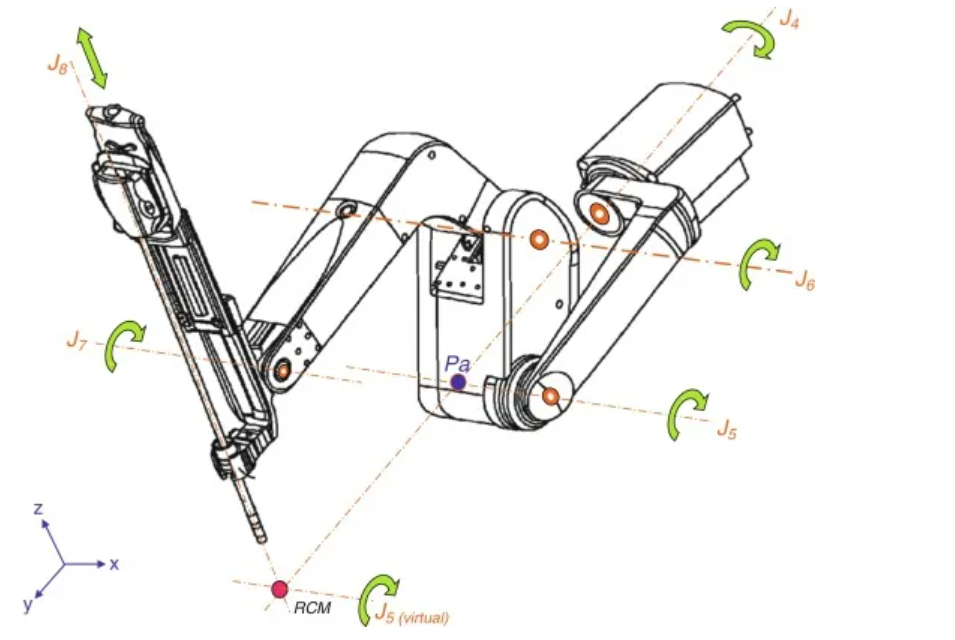 下图展示了达芬奇系统的主要结构。旋转驱动关节J4、J5共享同一轴Pa,而被动关节J6、J7的旋转复制J5的角运动到工具支架。因此,J5的作用就像位于RCM点一样。J8是一个棱柱关节,确保在RCM点为中心的平移。棱柱关节J8由多个堆叠的滑块通过缆绳和滑轮驱动。最终,达芬奇®系统主体由三个主动关节组成:工具轴向平移以及围绕患者进入点RCM的两个正交旋转。