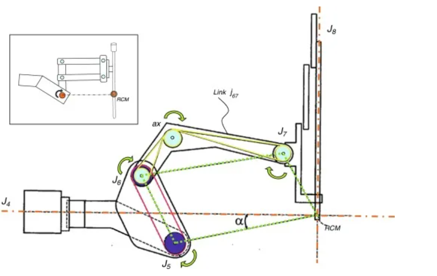 下图展示了达芬奇系统的RCM机制细节。被动关节J6通过电机驱动关节J5的缆绳(粉色)拉动。进而,J6移动连杆j67并通过缆绳(黄色)将其运动传递给J7滑轮,该滑轮连接到工具支架。这一机制使得J7能够获得与J5相同的角运动量,同时保持驱动器远离患者。整个系统如同一个角度保守的平行四边形(绿色虚线所示)。