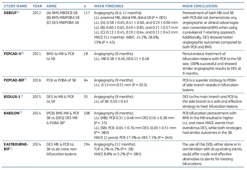 DEBIUT(分叉病变试验中的药物洗脱球囊)研究显示了相互矛盾的证据,其中6个月血管造影随访显示,基于DCB的策略与基于BMS的策略相比没有显著差异,并且被发现效果不如基于DES的策略。