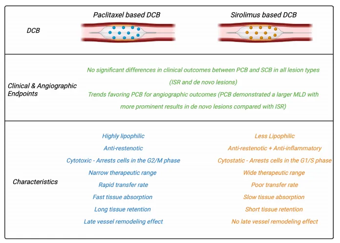 由于药物类型、配方、转移动力学和生物利用度的差异,DCBs不被认为具有类效应,因为不同DCB选项之间存在疗效和安全性特征的差异。图2突出了紫杉醇和西罗莫司DCB之间的主要差异。
