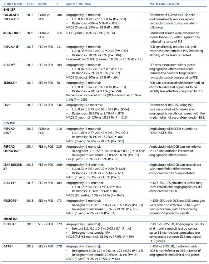 尽管新一代DES支架可能略微减少ISR病变的TLR需求,但额外支架层的风险使得DCB在球囊血管成形术后实现充分病变准备时成为BMS-和DES-ISR的首选。此外,可能受益于较短DAPT持续时间的患者可能更适合DCB治疗。因此,患者特定因素可能影响结局,并应指导治疗方式选择,由操作者判断并针对患者解剖和临床概况。然而,需要针对不同临床和解剖情况设计良好、以临床终点为效力、具有长期临床随访的研究来优化DCB在ISR中的作用。