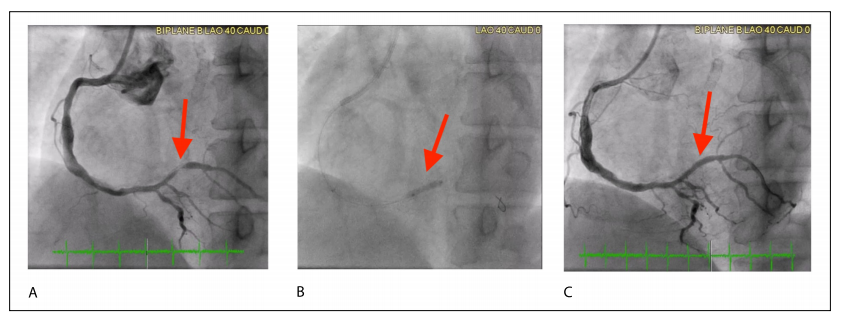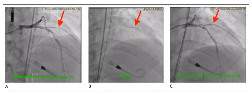 图3 冠状动脉造影图像展示使用药物涂层球囊(DCB)治疗支架内再狭窄(ISR)。(A) 术前图像显示靶血管存在90%的ISR。(B) 术中释放2.5 × 15 mm的AGENT药物涂层球囊,以6个大气压扩张60秒。(C) 术后图像显示DCB干预后ISR完全缓解,狭窄率为0%。