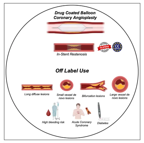DCBs向血管壁输送抗增殖药物,如紫杉醇或西罗莫司,并已成为传统支架疗法的有前景的替代方案,减少了永久性金属植入物的需求及相关血栓风险。早期研究证明了DCBs在ISR中的有效性,而近期研究已将其应用扩展到小血管疾病、分叉病变和长弥漫性病变。值得注意的是,在某些情况下,包括高风险患者和那些具有复杂冠状动脉解剖结构的患者,DCBs已显示出与药物洗脱支架(DES)的非劣效性。尽管存在一些挑战,如冠状动脉夹层的可能性和需要最佳病变准备,但DCBs在减少各种患者群体的再狭窄和改善长期结局方面显示出强大潜力。虽然需要进一步研究以优化其在超适应症应用中的使用,但DCBs可能代表了一种多功能、有效且更安全的CAD管理方法。