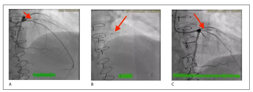图7 冠状动脉造影图像展示使用药物涂层球囊(DCB)治疗累及第一对角支开口处、狭窄程度达90%的原发小血管病变。(A) 术前图像显示第一对角支开口处存在90%狭窄。(B) 术中释放2.5 × 12 mm的AGENT药物涂层球囊,以4个大气压扩张60秒。(C) 术后图像显示DCB干预后狭窄程度改善至30%,血管通畅性显著提升。