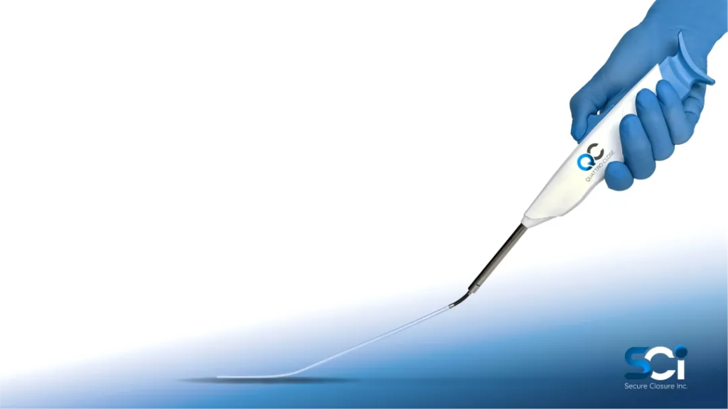 Secure Closure 公司瞄准这一空白,推出基于缝合技术的Quattro-Close闭合系统。该装置采用四针缝合与专利Halo-Lock技术,实现血管外闭合,旨在提供稳定可靠的单次解决方案。与当前机械封堵装置不同,其设计回归外科”金标准”理念,通过多点缝合降低动脉渗血风险。