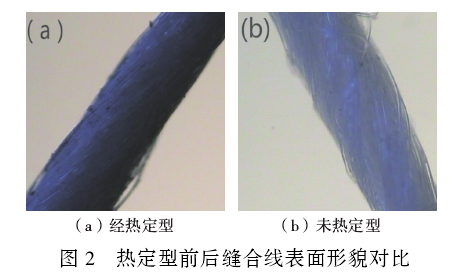 聚乳酸纤维的高结晶度使其具有形态稳定性和可热定型能力。由图可知,在未热定型时,聚乳酸长丝表面比较粗糙,较易松散。在经过热定型之后,加捻的聚乳酸长丝表面较光滑,大大减少了表面摩擦因数,说明热定型后的聚乳酸长丝比未定型聚乳酸长丝更紧凑。