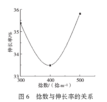 随着捻数的增加,缝合线的强力先增加后减小,伸长率先减小后增大。这说明在纤维根数一定的情况下,捻数对缝合线伸长率和强力存在影响,较优的捻数 为400-500 捻/m。